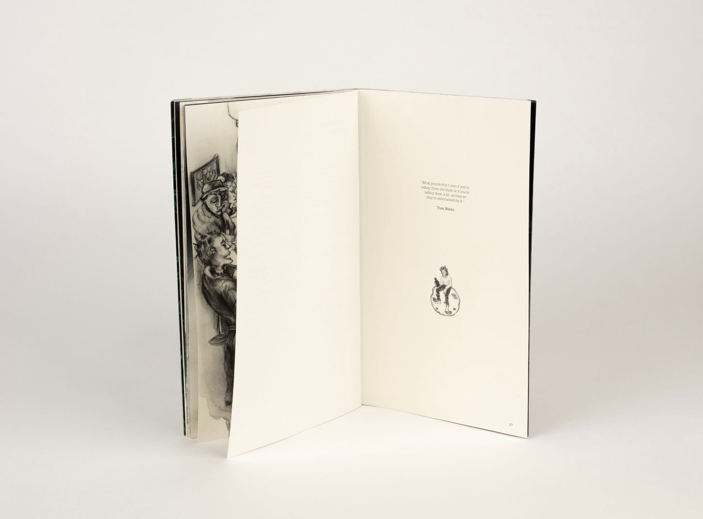 Tom Waits is famous for his smoky voice and idiosyncratic blues songs. With charm, he tells stories of nocturnal aberrations, everyday curiosities, hopeless romance and the darker side of life. As his songs have accompanied me since my youth, I have set myself the task of compiling ten Waits stories in a brochure and illustrating each with a lead picture. My illustrations are intended to give expression to the absurd stories and bizarre characters. The illustrations are done in pencil and reworked in Procreate.